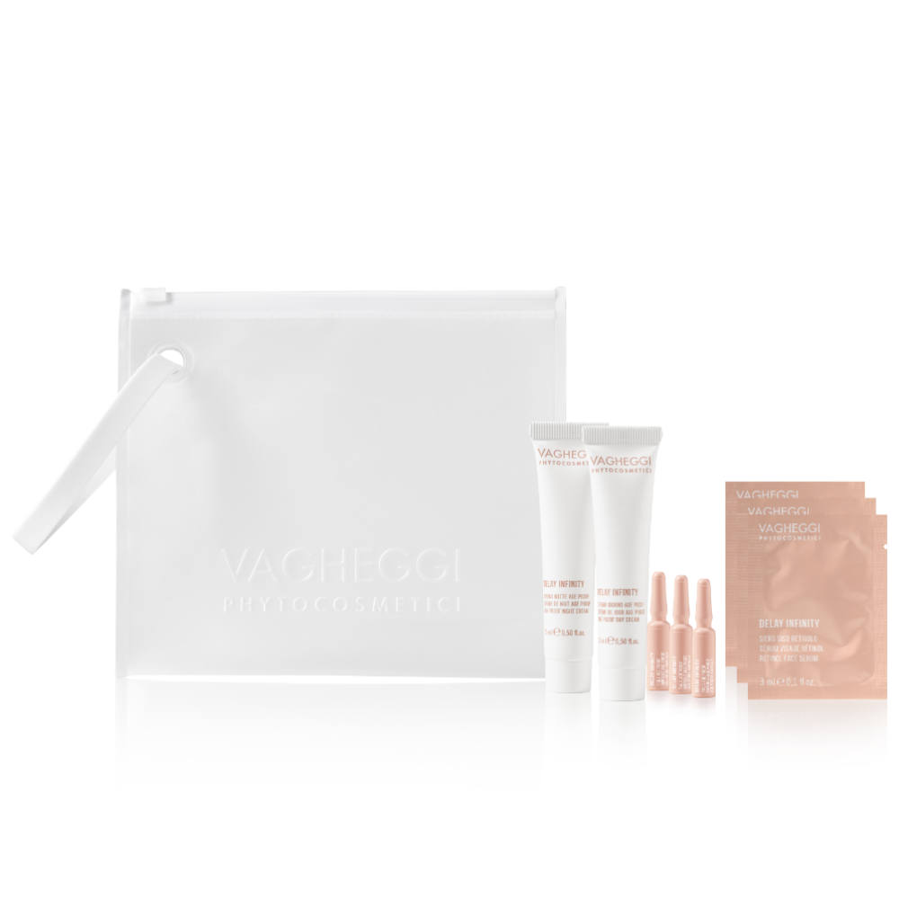 El kit descubre de Delay Infinity permite conocer la línea con sus productos imprescindibles. Contiene la crema de día, la crema de noche, el sérum de retinol y los viales.
